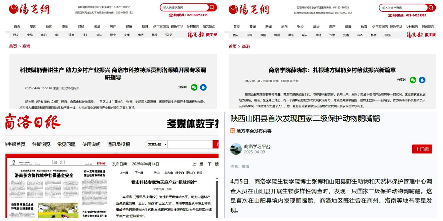 近日,學(xué)習(xí)強(qiáng)國學(xué)習(xí)平臺(tái)、陽光報(bào)、商洛日報(bào)等社會(huì)各界媒體紛紛報(bào)道我校教師服務(wù)秦嶺生態(tài)環(huán)境保護(hù)、助力鄉(xiāng)村振興和地方經(jīng)濟(jì)發(fā)展的典型事跡。4月5日,學(xué)習(xí)強(qiáng)國刊發(fā)《陜西山陽縣首次發(fā)現(xiàn)國家二級保護(hù)動(dòng)物鹮嘴鷸》一文,專題報(bào)道我校動(dòng)物學(xué)博士張博在山陽縣關(guān)于國家二級保護(hù)動(dòng)物鹮嘴鷸的重大發(fā)現(xiàn),及其助力秦嶺珍稀野生動(dòng)物多樣性研究和生態(tài)環(huán)境保護(hù)的工作紀(jì)實(shí)。4月7日、8日,《陽光報(bào)》分別刊發(fā)消息《科技賦能春耕生產(chǎn)助力鄉(xiāng)村產(chǎn)業(yè)...