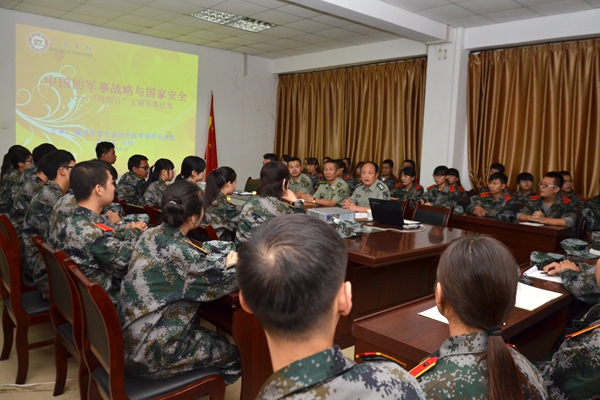 2015年9月9日,我校召開中國(guó)軍事戰(zhàn)略與國(guó)家安全主題座談會(huì)。解放軍西安政治學(xué)院軍事學(xué)系教授、2015級(jí)新生軍訓(xùn)團(tuán)團(tuán)長(zhǎng)劉京生大校,軍訓(xùn)團(tuán)副團(tuán)長(zhǎng)莊超中校,軍訓(xùn)團(tuán)副團(tuán)長(zhǎng)伊明強(qiáng)少校出席本次活動(dòng)。武裝部部長(zhǎng)、軍訓(xùn)團(tuán)政委石啟英主持座談。