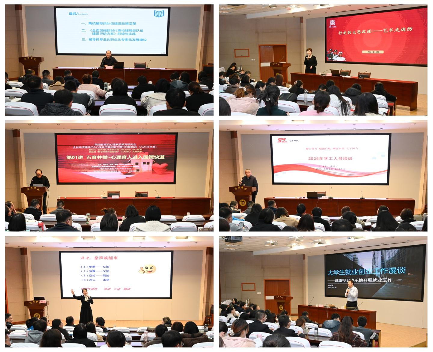 在為期兩天的培訓(xùn)期間,學(xué)校邀請省委教育工委學(xué)工部干部楊光、西安音樂學(xué)院馬克思主義學(xué)院教授張津波、陜西省高校心理素質(zhì)教育研究會會長鄭林科、全國優(yōu)秀思想政治教師明秀蘭、世界500強(qiáng)企業(yè)高級人才項(xiàng)目經(jīng)理馮瑞辰等學(xué)生工作領(lǐng)域?qū)<覍W(xué)者,圍繞學(xué)工隊(duì)伍職業(yè)化、專業(yè)化發(fā)展,以及國防教育、心理健康教育、畢業(yè)生就業(yè)創(chuàng)業(yè)工作等方面,為參訓(xùn)學(xué)員作專題報(bào)告講座和團(tuán)體輔導(dǎo)。學(xué)工部部長李彥廣深入剖析、詳細(xì)解讀了學(xué)工人員職責(zé)要求與職業(yè)發(fā)展。