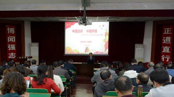 會(huì)上,我校圖書(shū)館館長(zhǎng)楊增強(qiáng)教授作了題為《中國(guó)選擇 中國(guó)驕傲——新中國(guó)七十年來(lái)的成就與思考》的專題報(bào)告,報(bào)告講述了新中國(guó)波瀾壯闊、激情澎湃、創(chuàng)意萬(wàn)千、日新月異的歷史性巨變,圍繞“七十年來(lái)新中國(guó)取得的成就”“七十年來(lái)新中國(guó)的歷史定位”“七十年來(lái)新中國(guó)發(fā)展的思考”“對(duì)未來(lái)發(fā)展的展望”四個(gè)方面進(jìn)行了詳細(xì)的講解。