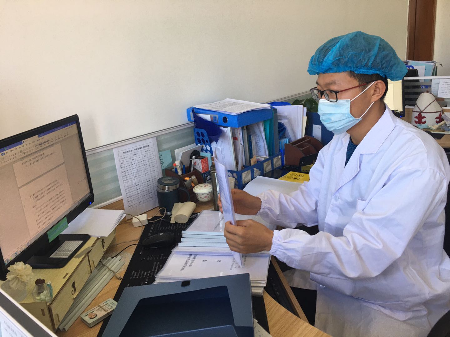 畢業(yè)于數(shù)學(xué)與計(jì)算機(jī)應(yīng)用學(xué)院統(tǒng)計(jì)專(zhuān)業(yè)1501班的蘆杉,實(shí)習(xí)結(jié)束后就業(yè)于伊犁市第九中學(xué),疫情期間堅(jiān)守防疫崗位,負(fù)責(zé)為隔離人員送餐、測(cè)量體溫、消殺房間、健康登記、衛(wèi)生清潔等工作。畢業(yè)于生物醫(yī)藥與食品工程學(xué)院生物技術(shù)專(zhuān)業(yè)的2019屆學(xué)生吳飛,就業(yè)于伊犁州特克斯縣第一中學(xué),被抽調(diào)到隔離點(diǎn)負(fù)責(zé)隔離人員檔案和心理輔導(dǎo)工作。早起晚睡的他,已連續(xù)工作半月有余,每天只能休息3個(gè)小時(shí)。為了核查清楚隔離人員的流調(diào)表,常常需要穿著防護(hù)服到隔離人員的房間,逐一詢(xún)問(wèn)其旅居史、接觸史和活動(dòng)軌跡。他說(shuō)“隔離點(diǎn)成立初期,工作量大、任務(wù)重,每天基本上都是凌晨5:00睡覺(jué),還要時(shí)刻關(guān)注隔離人員的心理動(dòng)態(tài)。有些人受疫情影響,情緒波動(dòng)比較大,有的甚至?xí)龀鰳O端行為,所以每天要和隔離人員通話(huà)聯(lián)系,了解其心理動(dòng)態(tài),建立臺(tái)帳。”