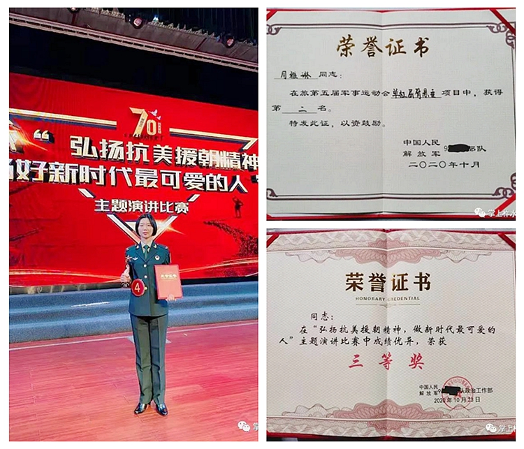 周雅琳從小就有一顆熾熱的軍人夢,2019年她積極響應國家號召,踴躍應征入伍,現(xiàn)為火箭軍某部戰(zhàn)士。在部隊上,她認真工作,嚴格按照標準完成各項任務,積極參加各項活動,參加單位“弘揚抗美援朝精神,當好新時代最可愛的人”主題演講比賽,榮獲三等獎。自主加強體能訓練,參加軍事運動會單杠屈臂懸重項目,獲得第二名。參加春晚排練及慰問演出等文藝活動,受到指導員和戰(zhàn)友們的一致肯定。同時,她愛好樂器演奏,還是單位軍樂隊單簧管演奏員。
