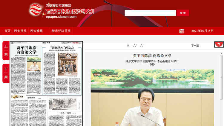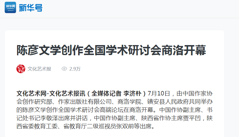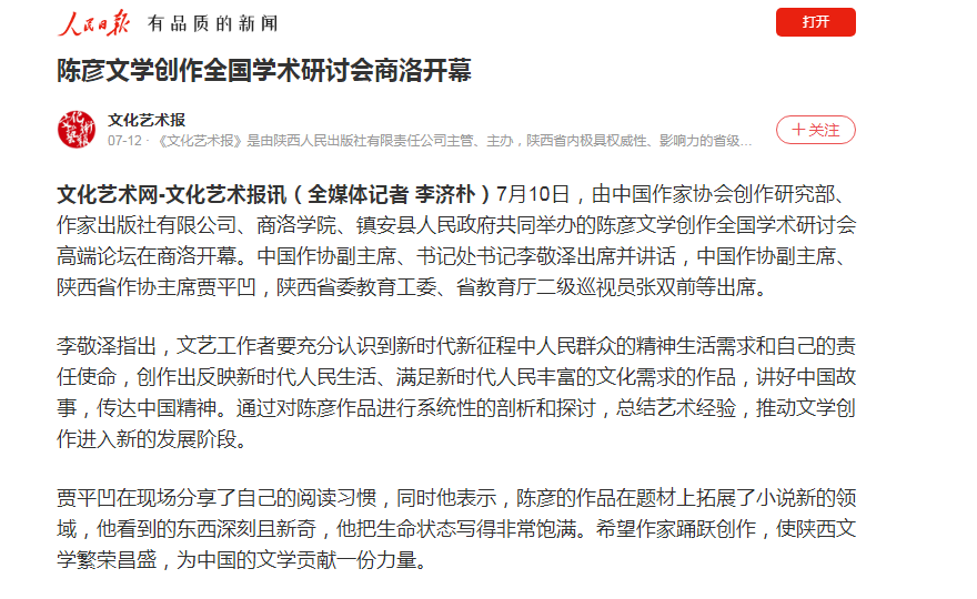 7月10日,由我校與中國(guó)作家協(xié)會(huì)創(chuàng)作研究部、作家出版社有限公司、鎮(zhèn)安縣人民政府聯(lián)合舉辦的陳彥文學(xué)創(chuàng)作全國(guó)學(xué)術(shù)研討會(huì)高端論壇在我校舉行。賈平凹、陳彥兩位著名商洛籍作家、茅盾文學(xué)獎(jiǎng)獲得者及50余位國(guó)內(nèi)文學(xué)界專家、學(xué)者齊聚我校開展研討交流。人民號(hào)、新華號(hào)、學(xué)習(xí)強(qiáng)國(guó)、華商網(wǎng)、搜狐網(wǎng)、新浪網(wǎng)、中華網(wǎng)、騰訊網(wǎng)、今日頭條、西部網(wǎng)、中國(guó)作家網(wǎng)、西安晚報(bào)、文化藝術(shù)報(bào)、陜西作家網(wǎng)、西安新聞網(wǎng)、商洛新聞網(wǎng)等中央、省、市媒體對(duì)我校陳彥文學(xué)創(chuàng)作全國(guó)學(xué)術(shù)研討會(huì)高端論壇紛紛進(jìn)行了報(bào)道。各類微信、微博等自媒體也紛紛報(bào)道和轉(zhuǎn)發(fā),使讀者進(jìn)一步了解了陳彥的文學(xué)世界,陳彥的文學(xué)藝術(shù)也將在更廣闊的空間傳播,積極促進(jìn)了商洛乃至陜西文學(xué)事業(yè)的繁榮發(fā)展,擴(kuò)大了我校的知名度和影響力。