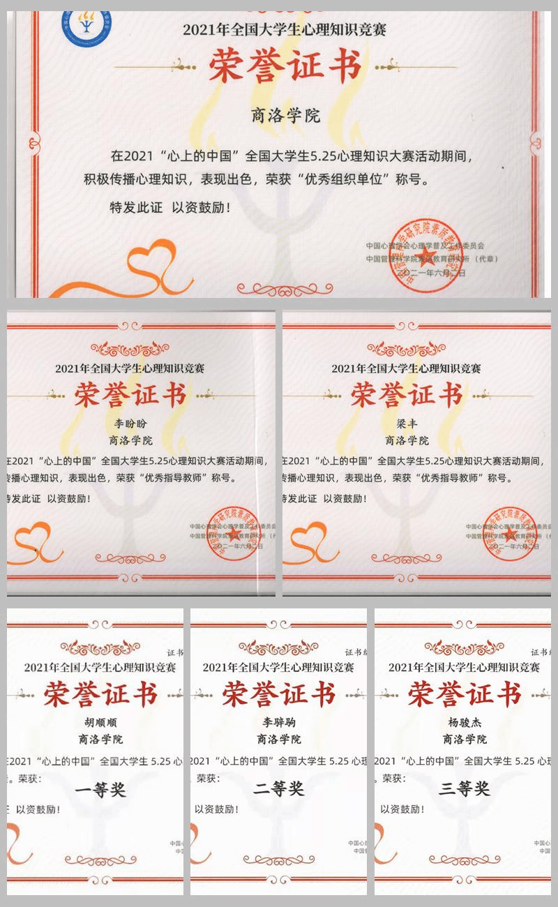 近日,2021“心上的中國”全國大學生5·25心理知識大賽活動圓滿落幕,我校健康管理學院心理學專業(yè)學生參加比賽,并獲得一等獎13項,二等獎3項,三等獎4項,學校榮獲“優(yōu)秀組織單位”,健康管理學院教師梁豐、李盼盼獲得“優(yōu)秀指導教師”。