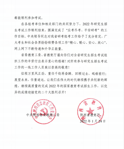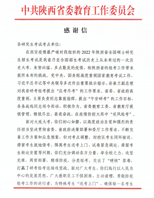 感謝信說(shuō),2022年研究生招生考試是我省乃至全國(guó)招生考試歷史上從未有過(guò)的一次歷史大考,來(lái)勢(shì)兇猛,多點(diǎn)散發(fā)的疫情給陜西省的組考工作帶來(lái)前所未有的挑戰(zhàn),面對(duì)大疫大考,我校初心如磐,以高度的政治自覺(jué)和強(qiáng)烈的責(zé)任擔(dān)當(dāng)堅(jiān)決貫徹省委、省政府決策部署和委廳工作要求,舉全校之力,攻堅(jiān)克難,周密部署,精準(zhǔn)防疫,分類(lèi)組考,交出了“硬核”答卷,打贏了考研組考這場(chǎng)攻堅(jiān)戰(zhàn),圓滿完成了“應(yīng)考盡考,平安考研”的工作目標(biāo)。廣大考生和社會(huì)各界稱贊各項(xiàng)工作“精心、暖心、安心、放心”,網(wǎng)上網(wǎng)下不斷傳遞升華正能量。