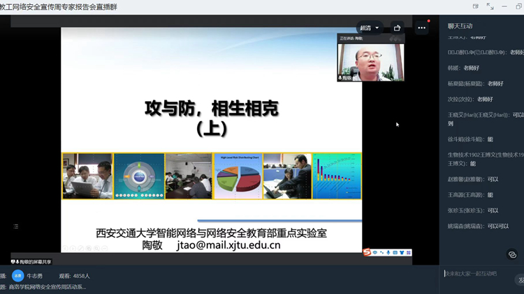 為推動第九屆網絡安全宣傳周活動深入開展,提升師生網絡安全意識和防護技能,營造網絡安全人人有責、網絡安全人人參與的濃厚氛圍,9月7日下午,我校通過線上平臺舉辦網絡安全知識專家報告會。大會邀請西安交通大學網絡空間安全學院副院長、智能網絡與網絡安全教育部重點實驗室副主任陶敬老師作了題為《攻與防,相生相克!》的專題報告。報告會由信息化建設與管理處負責人付軍昌主持,各單位網絡安全和信息化工作負責人、網絡安全和信息化專員,教師代表及2019、2020、2021級全體學生5000余人線上參加報告會。