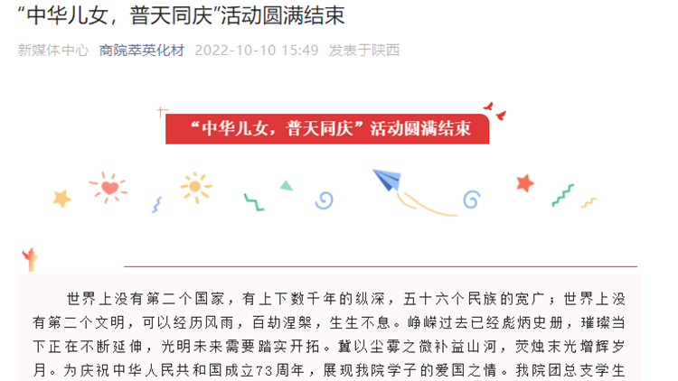 為深入開展“青春獻(xiàn)禮黨的二十大,強(qiáng)國有我新征程”主題宣傳教育活動,熱烈慶祝中華人民共和國成立73周年,引導(dǎo)和激勵(lì)廣大師生厚植愛國主義情懷,營造網(wǎng)絡(luò)文明新風(fēng),國慶節(jié)期間,我校組織開展了豐富多彩的“喜迎黨的二十大 歡度國慶節(jié)”系列主題活動。廣大師生通過各級各類網(wǎng)絡(luò)平臺和線上活動,用自己的方式為祖國送上美好祝福,禮贊新時(shí)代奮進(jìn)征程,以良好的精神面貌和昂揚(yáng)姿態(tài)喜迎黨的二十大勝利召開。