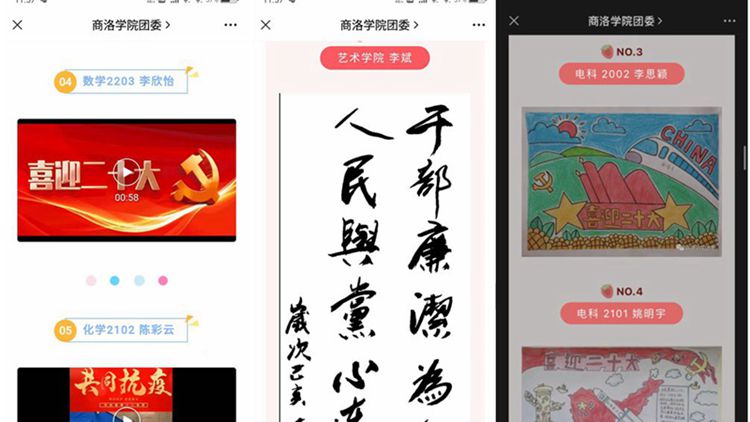 國(guó)慶期間,校團(tuán)委還面向全校師生開展了“喜迎黨的二十大、永遠(yuǎn)跟黨走、奮進(jìn)新征程”主題文藝作品征集評(píng)選活動(dòng)?;顒?dòng)中,師生將愛黨愛國(guó)的熱情傾注筆端,融入作品創(chuàng)作中。前后共收集到文學(xué)類、美術(shù)類、視頻類作品150余件,經(jīng)初審后評(píng)選出39件優(yōu)秀作品在校團(tuán)委公眾號(hào)展播,先后有9000余人次訪問(wèn)、7000余人次參與投票,最終評(píng)選出24件最佳作品予以表彰。