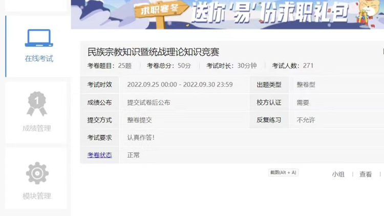 健康管理學(xué)院在易班APP上開展了民族宗教知識暨統(tǒng)戰(zhàn)理論知識競賽,全院所有新生均參與答題,進一步提高新生對習(xí)近平總書記關(guān)于民族團結(jié)進步重要論述、民族政策法規(guī)、民族基本常識等內(nèi)容的掌握。生物學(xué)院在易班APP上開展了以“迎華誕,學(xué)黨史”為主題的黨史知識競賽,同時在“學(xué)習(xí)大國”微信公眾號上參與民族宗教知識競賽暨統(tǒng)戰(zhàn)理論知識競賽,全院師生積極參與,答題率高達90%,提高了活動知曉度和普及率。