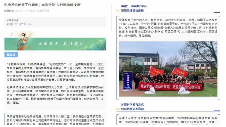 為慶祝黨的二十大勝利召開(kāi),全面展現(xiàn)黨的十八大以來(lái)科協(xié)系統(tǒng)工作成果,陜西省科協(xié)面向省級(jí)學(xué)會(huì)、市(區(qū))科協(xié)、高校科協(xié)、企業(yè)科協(xié)、省科協(xié)機(jī)關(guān)及直屬單位開(kāi)展優(yōu)秀工作案例征集活動(dòng),遴選出一批科協(xié)系統(tǒng)優(yōu)秀工作案例,在陜西科協(xié)微信公眾號(hào)向全社會(huì)展示。我?!班l(xiāng)村流動(dòng)館”項(xiàng)目順利入選,并成功獲批中國(guó)科協(xié)“翱翔之翼”大學(xué)生科技志愿服務(wù)項(xiàng)目。