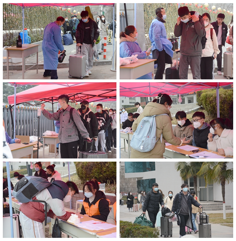 返校期間,各地學(xué)生嚴格按照流程,在規(guī)定時間內(nèi)分別從指定校門進入,經(jīng)過行李消殺、口罩更換、測量體溫,再到所在學(xué)院現(xiàn)場辦公處進行登記后返回宿舍。學(xué)生處、團委及各二級學(xué)院安排志愿者幫助入校學(xué)生搬運行李、辦理登記手續(xù),提供暖心服務(wù)。