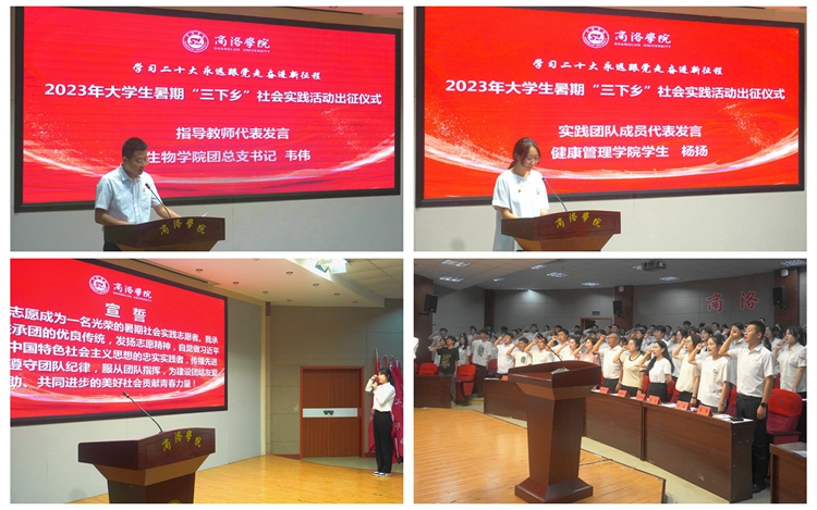 7月12日,我校舉行“學(xué)習(xí)二十大 永遠(yuǎn)跟黨走 奮進(jìn)新征程”2023年大學(xué)生暑期“三下鄉(xiāng)”社會實踐活動出征儀式。學(xué)生處、團(tuán)委負(fù)責(zé)人出席活動,各二級學(xué)院團(tuán)總支書記、指導(dǎo)教師代表和實踐團(tuán)隊成員代表參加活動。