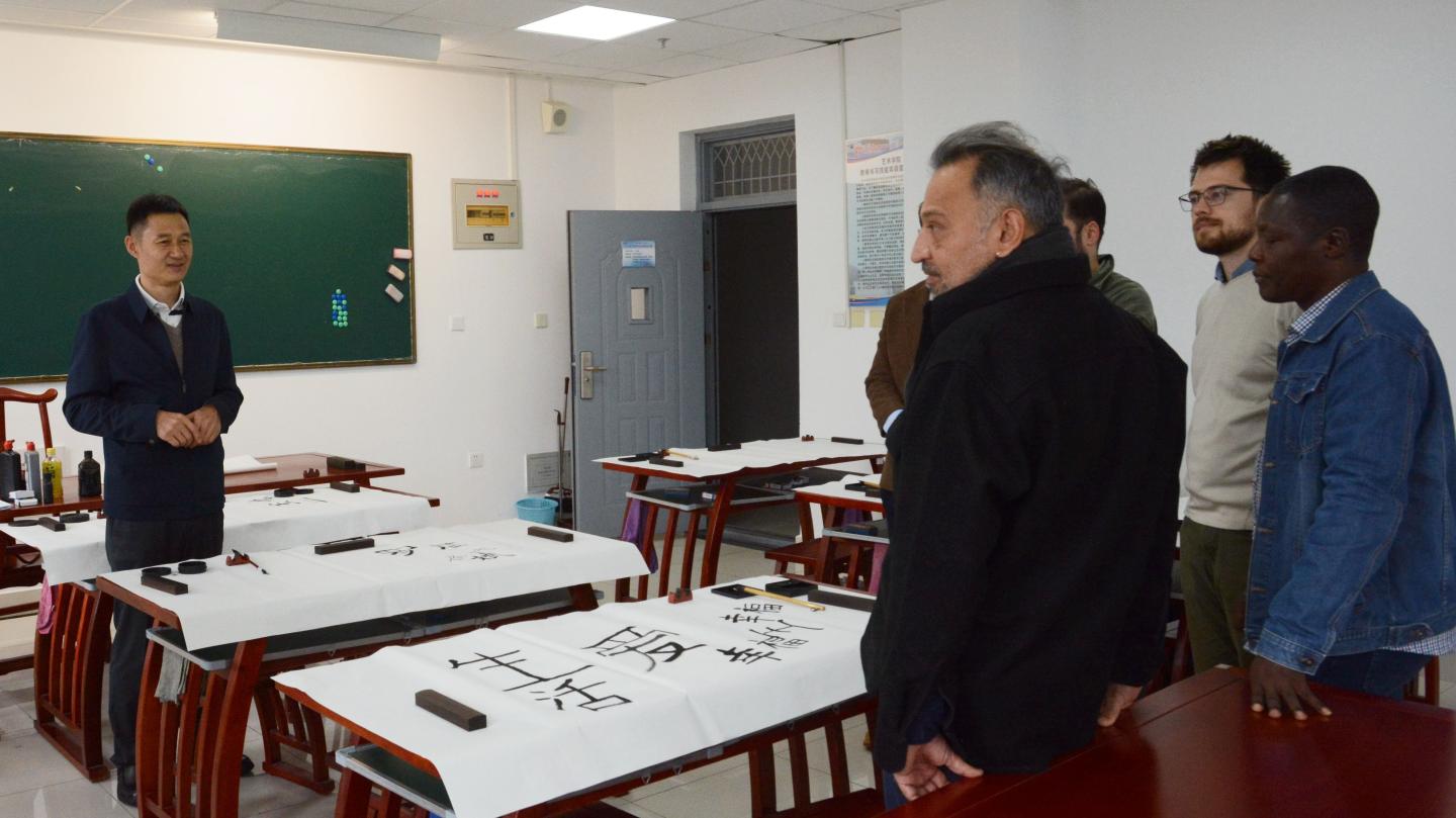 在工作人員的引導(dǎo)下,外籍教師先后參觀了經(jīng)管學(xué)院教室、綜合實(shí)驗(yàn)室、特色計(jì)算機(jī)實(shí)驗(yàn)室,電信學(xué)院實(shí)驗(yàn)室、人工智能機(jī)器人實(shí)訓(xùn)室,藝術(shù)學(xué)院智慧書法實(shí)驗(yàn)室、藝術(shù)展廳,商洛文化暨賈平凹研究中心,商洛紅色文化資料館,陜西省尾礦重點(diǎn)實(shí)驗(yàn)室,學(xué)校發(fā)展成就展廳及秦嶺植物標(biāo)本陳列室。在智慧書法教室,藝術(shù)學(xué)院教師樊洪濤為外籍教師介紹了中國書畫的傳承與發(fā)展歷史,并指導(dǎo)外籍教師進(jìn)行了書法體驗(yàn),“沉浸式”感受了中國傳統(tǒng)文化魅力。