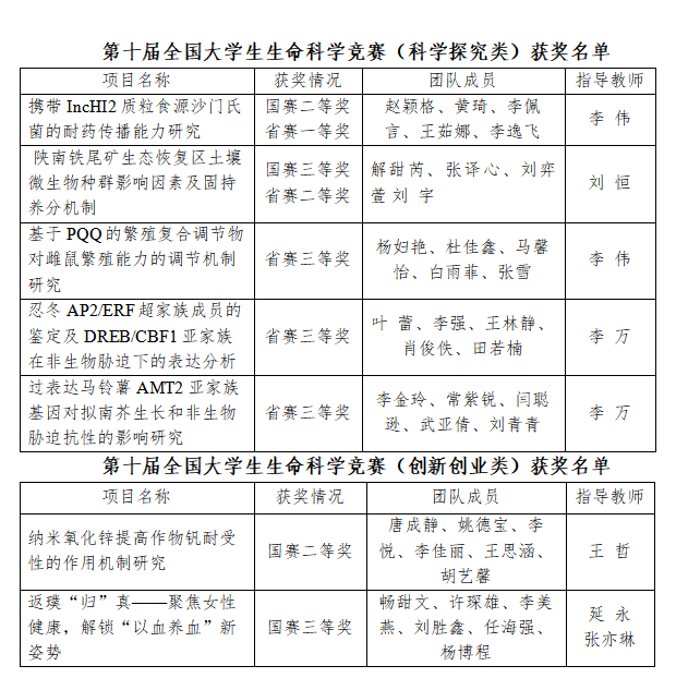 近日,第十屆全國(guó)大學(xué)生生命科學(xué)競(jìng)賽科學(xué)探究類和創(chuàng)新創(chuàng)業(yè)類全國(guó)總決賽分別落幕。我校學(xué)生在本屆競(jìng)賽中表現(xiàn)出色,榮獲第十屆全國(guó)大學(xué)生生命科學(xué)競(jìng)賽科學(xué)探究類全國(guó)總決賽二等獎(jiǎng)1項(xiàng)、三等獎(jiǎng)1項(xiàng),陜西省賽區(qū)一等獎(jiǎng)1項(xiàng)、二等獎(jiǎng)1項(xiàng)、三等獎(jiǎng)3項(xiàng),榮獲創(chuàng)新創(chuàng)業(yè)類全國(guó)總決賽二等獎(jiǎng)和三等獎(jiǎng)各1項(xiàng)。