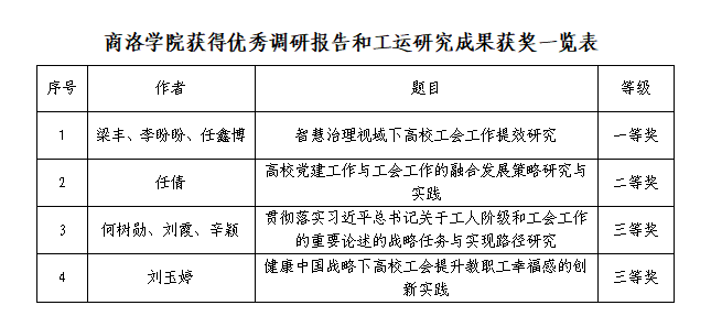 近日,陜西省教科文衛(wèi)體工會發(fā)布了《關于2024年全省教科文衛(wèi)體系統(tǒng)工會優(yōu)秀調(diào)研報告和工運研究成果評審結果的通報》,我校工會被評為2024年全省教科文衛(wèi)體工會調(diào)查研究工作先進單位。同時,我校獲得優(yōu)秀調(diào)研報告和工運研究成果一、二等獎各1項,三等獎2項。
