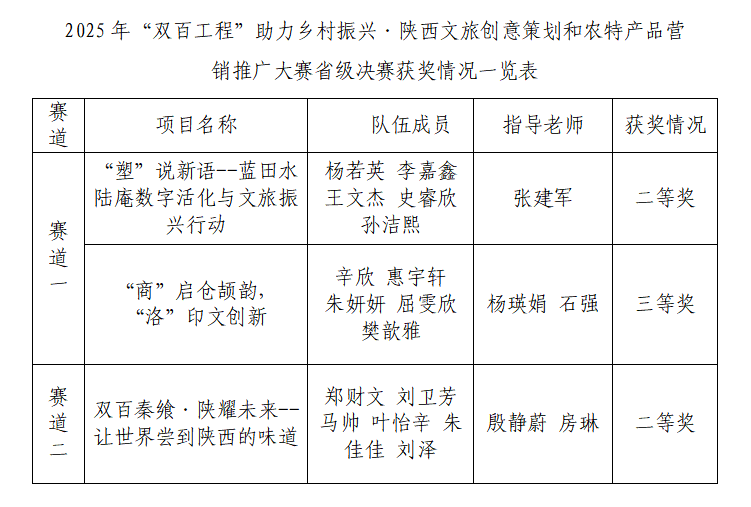 11月29日,由陜西省委教育工委主辦的2025年“雙百工程”助力鄉(xiāng)村振興·陜西文旅創(chuàng)意策劃和農(nóng)特產(chǎn)品營銷推廣大賽省級決賽在西北政法大學(xué)長安校區(qū)舉辦。我校選派的3支參賽團(tuán)隊在激烈角逐中脫穎而出,最終榮獲二等獎2項、三等獎1項,充分展現(xiàn)了學(xué)校在服務(wù)鄉(xiāng)村振興戰(zhàn)略中的顯著成效。