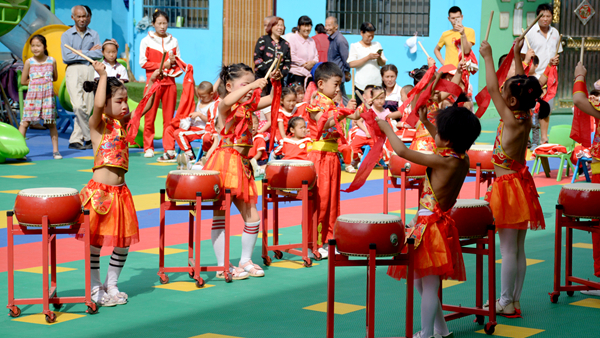 兩嶺幼兒園園長米嬌致答謝詞。幼兒園小朋友們現(xiàn)場表演了精彩的鑼鼓舞和花環(huán)舞,并為嘉賓們送去愛心糖果、手工折紙等以表感謝。