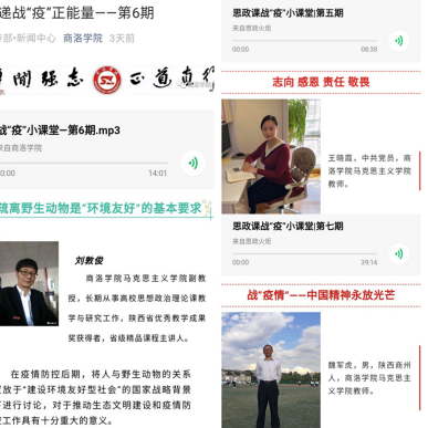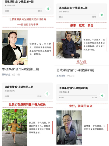 為貫徹落實習近平總書記關于新冠肺炎疫情防控工作的重要講話和指示精神,全力支持配合打贏疫情防控戰(zhàn)、總體戰(zhàn)、阻擊戰(zhàn),按照教育部黨組“停課不停教、停課不停學”的要求,積極響應教育部舉辦的高?!八颊n戰(zhàn)役小課堂”專項活動,助力思政課線上教學,我校馬克思主義學院通過微信公眾號開辦了“思政課戰(zhàn)疫小課堂”專題欄目,組織學院教師錄制思政微課,通過文字、圖片加音頻的形式定期向學生推送,同時還通過學校官方微信公眾號進行推送,以擴大學生覆蓋面。目前,“思政課戰(zhàn)役小課堂”已經發(fā)布7期內容,獲得了師生廣泛關注,進一步激發(fā)了師生從我做起、助力抗疫的積極性和自覺性,堅定了青年一代勇?lián)鷷r代使命的決心和信心。