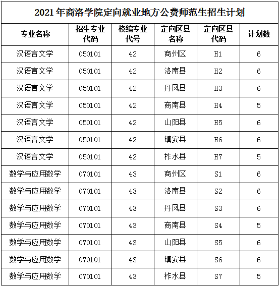 2021年我校招收定向就業(yè)地方公費(fèi)師范生的專業(yè)有漢語(yǔ)言文學(xué)和數(shù)學(xué)與應(yīng)用數(shù)學(xué),招生計(jì)劃各40名,分別以定向就業(yè)商洛市各區(qū)、縣設(shè)置招生代碼,招生批次為提前批本科。