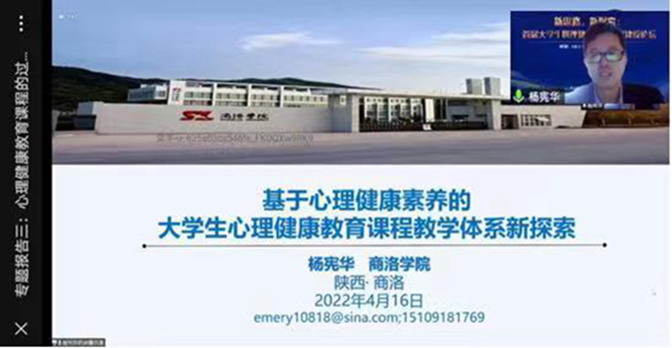 4月16日至17日,中國心理衛(wèi)生協(xié)會大學(xué)生心理咨詢專委會聯(lián)合國家社科基金重大項目“國民心理衛(wèi)生素養(yǎng)及其提升機(jī)制與對策”項目組舉辦全國“新思路,新探索:首屆大學(xué)生心理健康教育課程建設(shè)論壇” 線上學(xué)術(shù)論壇,我校健康學(xué)院楊憲華副教授受邀在“專題報告”環(huán)節(jié)作交流發(fā)言。