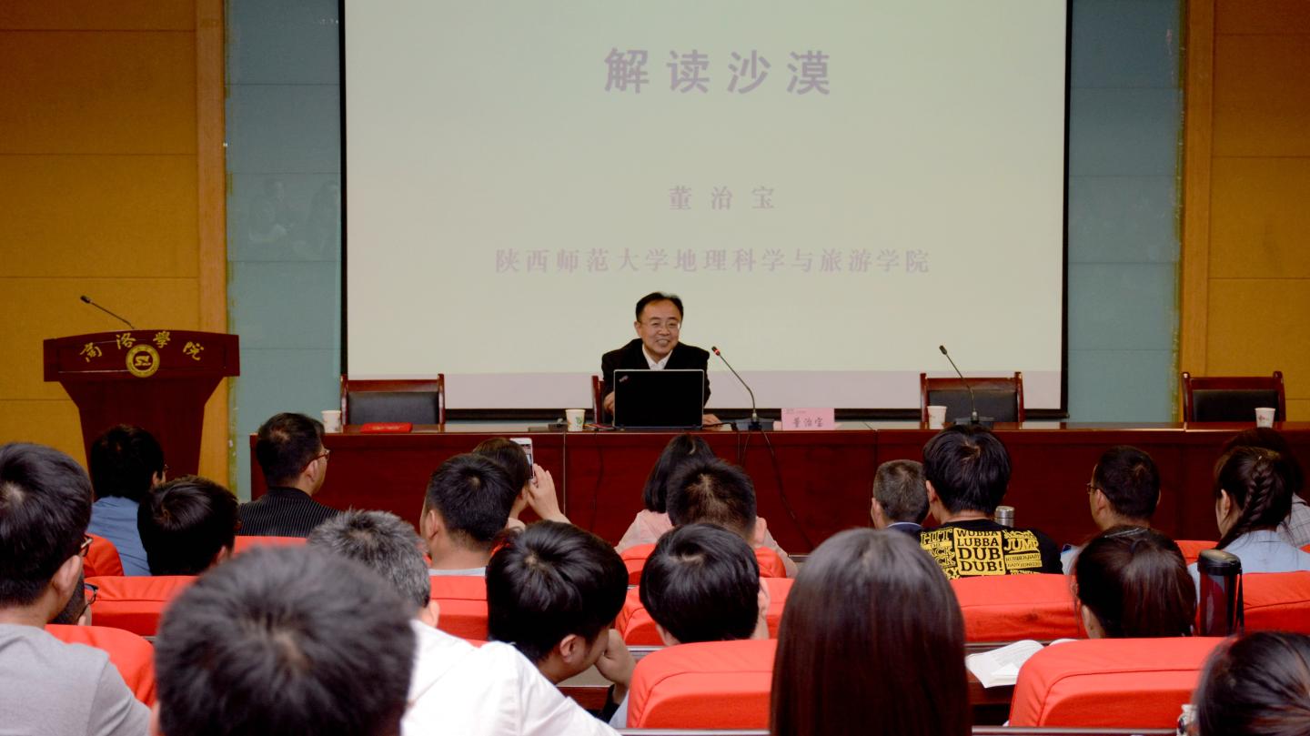 受聘儀式后,董教授以“解讀沙漠”為題作了學(xué)術(shù)報(bào)告。報(bào)告中,他從沙漠兩字蘊(yùn)含的文化、沙漠的形成、沙漠中水的作用、沙產(chǎn)業(yè)等方面,對沙漠進(jìn)行了多維度的深入解讀。報(bào)告幽默風(fēng)趣、內(nèi)容新穎,獲得在場師生陣陣掌聲。董教授還與師生親切互動,詳細(xì)解答了師生提出的學(xué)術(shù)問題。