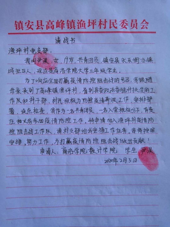 “請村支書給我安排工作任務”“請黨組織在疫情防控阻擊戰(zhàn)中考驗我”。這擲地有聲的話語,是商洛學院大三女學生尹淏2月3日和2月6日給高峰鎮(zhèn)漁坪村第一書記王新橋遞交的《請戰(zhàn)書》和《入黨申請書》里的兩句話。