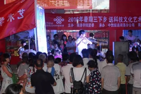 我校藝術(shù)學(xué)院十多名同學(xué)組建的文化藝術(shù)服務(wù)團先后在商州區(qū)、丹鳳、洛南等縣區(qū)的十多個鎮(zhèn)開展了精彩紛呈的文藝演出。通過形式多樣、內(nèi)容豐富的節(jié)目表演,既為當(dāng)?shù)厝罕娝腿チ讼娜盏那鍥觯沧寣W(xué)生增長了見識,提升了才干。所到之處,文化藝術(shù)服務(wù)團精彩的表演都贏得了在場觀眾的熱烈掌聲與陣陣喝彩。