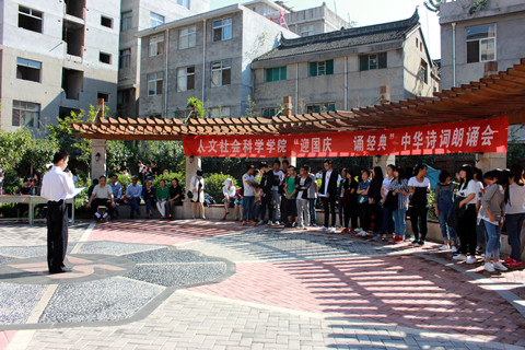 為深入學(xué)習(xí)貫徹習(xí)近平總書記系列重要講話精神,傳承中華民族優(yōu)秀傳統(tǒng)文化,9月21日,人文社會(huì)科學(xué)學(xué)院在莘子苑舉辦了“迎國(guó)慶,誦經(jīng)典”中華詩詞朗誦會(huì),以朗誦詩歌的形式迎接國(guó)慶佳節(jié)的來臨。人文社會(huì)科學(xué)學(xué)院全體師生參加了本次活動(dòng)。