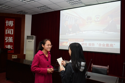 3月3日和3月5日,政協(xié)第十二屆全國(guó)委員會(huì)第五次會(huì)議、十二屆全國(guó)人大五次會(huì)議分別在北京人民大會(huì)堂開(kāi)幕。我校組織師生在報(bào)告廳集中收看了開(kāi)幕式實(shí)況直播,師生們分別通過(guò)手機(jī)、網(wǎng)絡(luò)、電視、廣播等媒體積極收看收聽(tīng),對(duì)兩會(huì)精神、熱點(diǎn)話(huà)題進(jìn)行了學(xué)習(xí)討論。