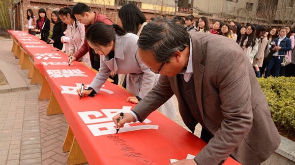 3月9日,文傳學(xué)院學(xué)子在莘子苑舉行“雷鋒月”活動(dòng)啟動(dòng)儀式,學(xué)子們?cè)凇爸驹阜?wù)耀商洛,青春共筑中國(guó)夢(mèng)”橫幅上簽下自己的名字,紛紛表示要傳承雷鋒精神、踐行社會(huì)主義核心價(jià)值觀。