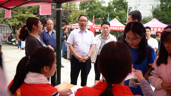 “你們辛苦了,感謝你們!”在奔忙的學(xué)生志愿服務(wù)點(diǎn)前,校領(lǐng)導(dǎo)為志愿者熱情投身迎新志愿服務(wù)工作點(diǎn)贊。在新生報(bào)到點(diǎn),校領(lǐng)導(dǎo)為家庭經(jīng)濟(jì)困難學(xué)生發(fā)放愛(ài)心禮包,與遠(yuǎn)道而來(lái)的新生及家長(zhǎng)親切交談,問(wèn)詢他們的報(bào)到情況,并向他們介紹商洛的歷史人文、自然風(fēng)光和我校的辦學(xué)特色。