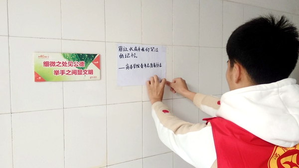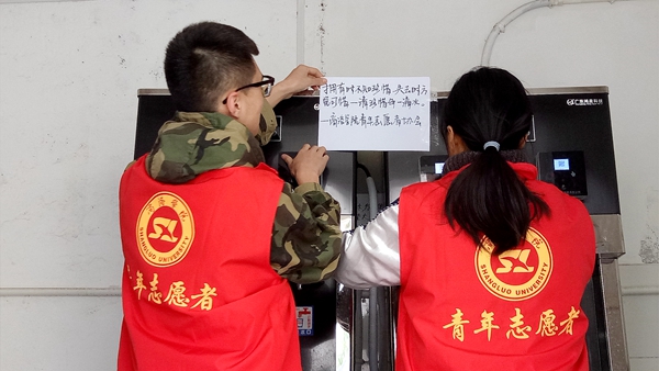 青年志愿者協(xié)會(huì)開(kāi)展“珍惜水資源,為生命留一條清流”活動(dòng)?;顒?dòng)中,志愿者們分別在教學(xué)樓各處飲水機(jī)、宿舍樓水龍頭旁張貼珍惜水資源的愛(ài)心標(biāo)語(yǔ),倡導(dǎo)師生們節(jié)水愛(ài)水,保護(hù)我們賴以生存的水資源。