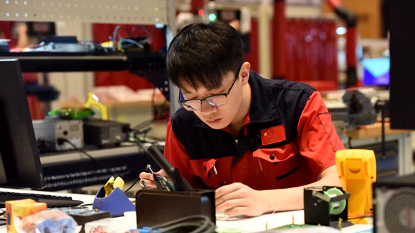 高雨楠所參加的制造團(tuán)隊(duì)挑戰(zhàn)賽項(xiàng)目是世界技能大賽中唯一一個(gè)3人團(tuán)隊(duì)項(xiàng)目,隊(duì)友劉培桐和詹志遠(yuǎn),他們都是來(lái)自廣東省機(jī)械技師學(xué)院的大學(xué)生。比賽中,他們3個(gè)人需要在3天的時(shí)間內(nèi)使用原材料,現(xiàn)場(chǎng)制造出一輛電驅(qū)動(dòng)救險(xiǎn)車,通俗地說(shuō)就是一個(gè)排爆機(jī)器人。其中包括機(jī)械繪圖、電路搭建、控制程序編制、零件制造、產(chǎn)品裝配、整車調(diào)試和性能達(dá)標(biāo)檢測(cè)。與世界技能大賽其他的單項(xiàng)技能比賽不同,高雨楠參賽的項(xiàng)目是一個(gè)全能項(xiàng)目,涵蓋的技能多達(dá)十余種,因此每個(gè)人都有自己專項(xiàng)的技能和嚴(yán)格的角色分工。高雨楠是團(tuán)隊(duì)中的設(shè)計(jì)選手,主要負(fù)責(zé)產(chǎn)品設(shè)計(jì)、圖紙繪制、電路搭建、控制程序編制等工作。賽前,他們經(jīng)過(guò)了長(zhǎng)達(dá)半年每天高強(qiáng)度的地獄式培訓(xùn)和無(wú)情的淘汰選拔。所有選手都鉚著一股勁你追我趕,比技能、拼毅力、補(bǔ)短板,你加班干我也加班干,相互較勁,就看誰(shuí)能堅(jiān)持到最后。那段時(shí)間,高雨楠沒(méi)有休息日的概念,有的只是墻上倒計(jì)時(shí)牌顯示的天數(shù)。從最開始的12個(gè)選手,到后來(lái)的6個(gè)選手,最后淘汰到3人團(tuán)隊(duì),很慶幸,高雨楠一直堅(jiān)持到了最后。高雨楠說(shuō),雖然訓(xùn)練是艱苦的,但是當(dāng)我們參加入場(chǎng)式手拿國(guó)旗進(jìn)入會(huì)場(chǎng)時(shí),我們感覺(jué)到無(wú)比的光榮,尤其是當(dāng)我們站到領(lǐng)獎(jiǎng)臺(tái)上的時(shí)候,更是感覺(jué)到這一切付出都是值得的。