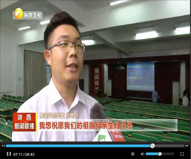 陜西電視臺(tái)《陜西新聞聯(lián)播》《絲路新聞》頻道于10月3日,商洛電視臺(tái)《商洛新聞聯(lián)播》頻道于10月1日,分別對(duì)我校師生集體收看慶祝中華人民共和國(guó)成立70周年大會(huì)、閱兵式、群眾游行直播情況進(jìn)行了報(bào)道。收看現(xiàn)場(chǎng),師生們激情澎湃,教室里不時(shí)響起熱烈掌聲,大家都為祖國(guó)的日益強(qiáng)大感到無(wú)比振奮和自豪。節(jié)目組現(xiàn)場(chǎng)采訪了我校黨委副書記彭虎軍、學(xué)生許文佳和孫增印。彭虎軍說(shuō):今天是祖國(guó)母親70歲生日,內(nèi)心非常高興,也非常激動(dòng),剛才聆聽了習(xí)近平總書記的重要講話,覺得很受鼓舞,堅(jiān)定了信心,催人奮進(jìn)。許文佳說(shuō):給我印象最深刻的是飛機(jī)的表演,我們已經(jīng)不是當(dāng)時(shí)剛開國(guó)典禮時(shí)僅存的那幾個(gè)飛機(jī),我們現(xiàn)在有高科技的軍事裝備,我們的國(guó)家也越來(lái)越強(qiáng)大,在世界上展示著大國(guó)的風(fēng)采。孫增印說(shuō):在這個(gè)特殊的日子,我想祝愿我們的祖國(guó)母親生日快樂,祝愿我們的國(guó)家更加繁榮昌盛。