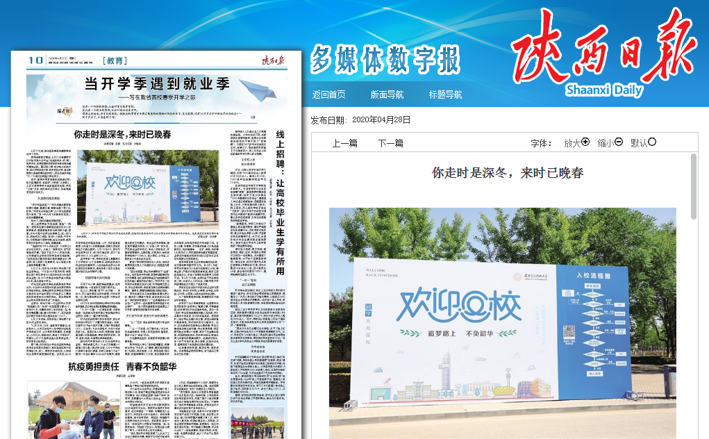 按照省教育廳規(guī)定,4月27日各高??梢蚤_始安排畢業(yè)年級(含高職和本、碩、博)、醫(yī)學(xué)專業(yè)、醫(yī)學(xué)類院校和有科研任務(wù)的學(xué)生錯時錯峰返校。近日,陜西日報記者深入省內(nèi)高校,采訪報道了包括我校在內(nèi)的數(shù)所高校,精心做好疫情防控和開學(xué)準(zhǔn)備工作,在明媚春光中,敞開校門,擁抱歸來學(xué)子。其中涉及我校內(nèi)容如下: