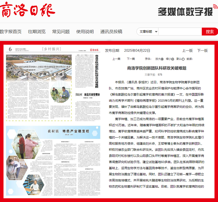 本報(bào)訊 (通訊員 李旭歡)近日,商洛學(xué)院生物學(xué)院魔芋創(chuàng)新團(tuán)隊(duì)、市農(nóng)技推廣站、商州區(qū)農(nóng)業(yè)農(nóng)村環(huán)境保護(hù)與能源中心合作撰寫的《解鳥氨酸拉烏爾菌引起魔芋軟腐病的首次報(bào)道》一文,在中國國際影響力優(yōu)秀學(xué)術(shù)期刊《植物病理學(xué)報(bào)》2025年3月的期刊上刊登。這一重要發(fā)現(xiàn),填補(bǔ)了由解鳥氨酸拉烏爾菌引起魔芋病害研究的空白,將為我市魔芋病害防控提供關(guān)鍵理論支撐。