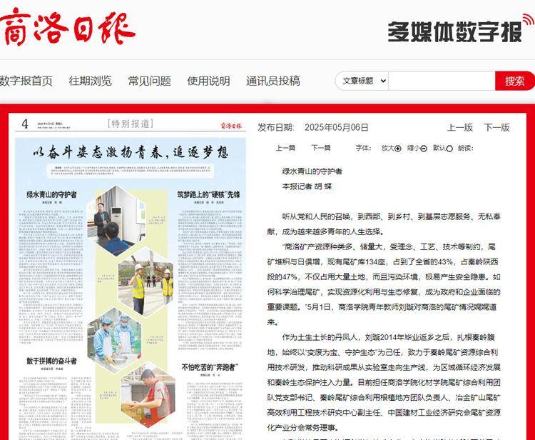 作為黨支部書(shū)記,劉璇還將黨建與科研深度融合,以“黨建紅生態(tài)綠 當(dāng)好秦嶺衛(wèi)士”為目標(biāo),帶領(lǐng)團(tuán)隊(duì)開(kāi)展尾礦建材化、生態(tài)化利用研究,獲批“冶金礦山尾礦高效利用工程技術(shù)研究中心”并聯(lián)合發(fā)起“中國(guó)建材工業(yè)經(jīng)濟(jì)研究會(huì)尾礦資源化產(chǎn)業(yè)分會(huì)”,培養(yǎng)出多名省市級(jí)科技副總和青年學(xué)者,為行業(yè)輸送大批技術(shù)骨干。研究成果在多家企業(yè)推廣,形成了從基礎(chǔ)研究到產(chǎn)業(yè)落地的完整創(chuàng)新鏈,為秦嶺礦產(chǎn)綠色開(kāi)發(fā)與生態(tài)保護(hù)提供了理論支撐。