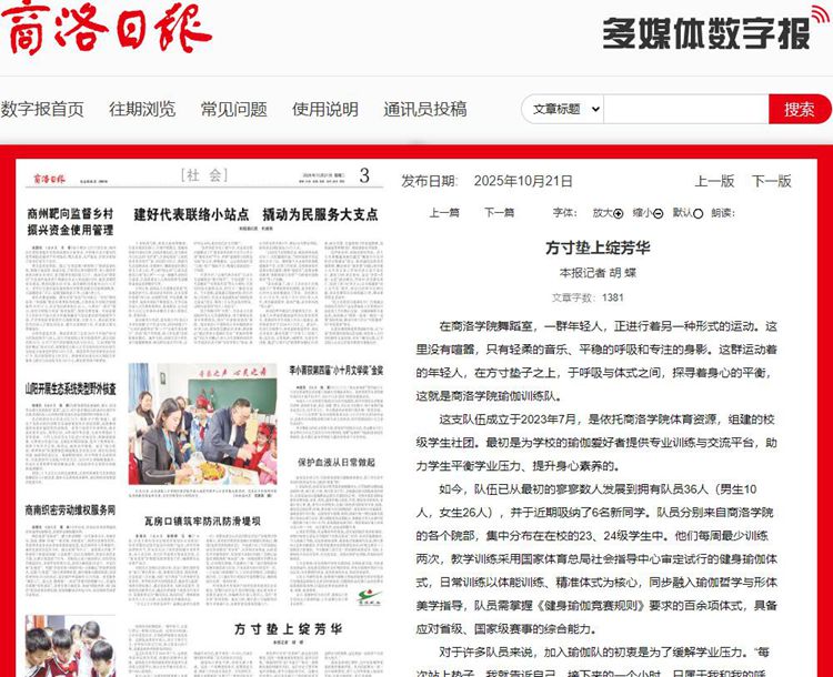 這支隊(duì)伍成立于2023年7月,是依托商洛學(xué)院體育資源,組建的校級學(xué)生社團(tuán)。最初是為學(xué)校的瑜伽愛好者提供專業(yè)訓(xùn)練與交流平臺,助力學(xué)生平衡學(xué)業(yè)壓力、提升身心素養(yǎng)的。