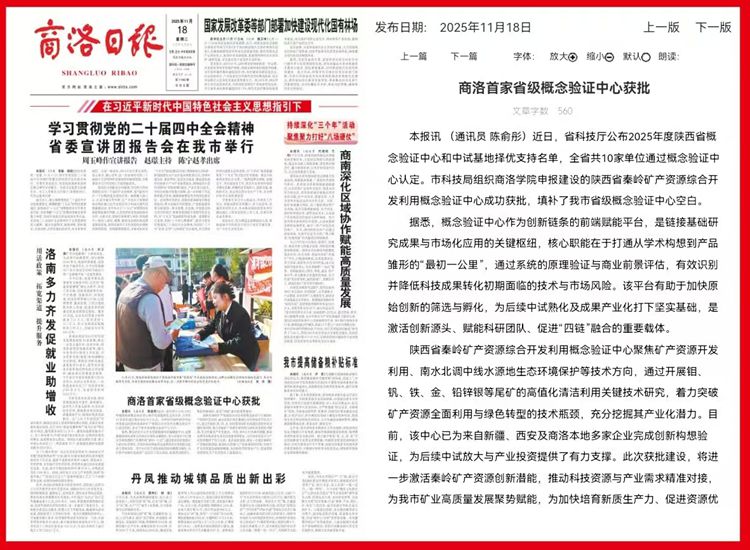 本報(bào)訊 (通訊員 陳俞彤)近日,省科技廳公布2025年度陜西省概念驗(yàn)證中心和中試基地?fù)駜?yōu)支持名單,全省共10家單位通過概念驗(yàn)證中心認(rèn)定。市科技局組織商洛學(xué)院申報(bào)建設(shè)的陜西省秦嶺礦產(chǎn)資源綜合開發(fā)利用概念驗(yàn)證中心成功獲批,填補(bǔ)了我市省級(jí)概念驗(yàn)證中心空白。