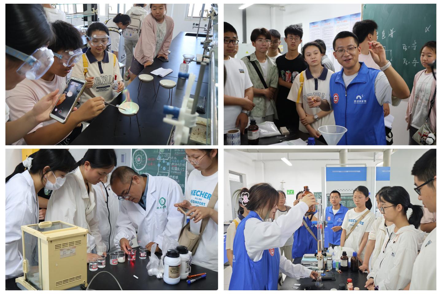 在無機化學(xué)實驗室,高霞博士以“點亮化學(xué)之光 —— 焰色反應(yīng)實驗探秘” 為主題,從原子結(jié)構(gòu)與電子躍遷理論出發(fā),解析鈉、鉀等金屬鹽溶液灼燒顯色的科學(xué)原理,結(jié)合礦物分析等生活實例,帶領(lǐng)學(xué)生領(lǐng)略化學(xué)視覺奇觀,實驗師劉萍指導(dǎo)學(xué)生完成實驗,辨識不同金屬焰色。有機化學(xué)實驗室中,王以壽博士以 “薄層色譜、柱色譜分離技術(shù) —— 色素的高效分離” 為核心,結(jié)合蘇丹紅檢測等科研實例,講解色譜技術(shù)在食品安全等領(lǐng)域的應(yīng)用,學(xué)生在志愿者協(xié)助下體驗染料分離實驗。物理化學(xué)實驗室內(nèi),劉永亮博士以牛奶等生活膠體現(xiàn)象為切入點,指導(dǎo)學(xué)生制備膠體,觀察丁達爾效應(yīng)等現(xiàn)象,理解膠體應(yīng)用價值。化學(xué)教學(xué)論實驗室里,史景濤博士以橙子等為樣本,帶領(lǐng)學(xué)生開展實驗,通過果汁對高錳酸鉀溶液的還原反應(yīng),探究維生素 C 還原性及酸度影響,搭建學(xué)科認(rèn)知橋梁。