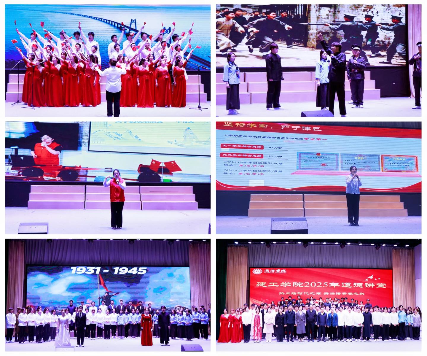本期道德講堂精心設(shè)計(jì)了“時(shí)政鑄魂”“榜樣示范”“青春踐道”三個(gè)篇章,通過“跳一支舞蹈、誦一段經(jīng)典、唱一首歌曲、講一個(gè)故事、做一個(gè)承諾、演一段歷史、送一份吉祥”等豐富形式,生動(dòng)詮釋了新時(shí)代青年的責(zé)任與擔(dān)當(dāng)?;顒?dòng)在舞蹈《領(lǐng)航新時(shí)代》中拉開帷幕,同學(xué)們以充滿力量的舞姿展現(xiàn)出新時(shí)代青年緊跟時(shí)代、奮勇前行的精神風(fēng)貌。誦讀《以青春之氣,逐華夏之夢(mèng)》抒發(fā)了建工學(xué)子們以夢(mèng)為馬、投身民族復(fù)興的堅(jiān)定信念。歌曲聯(lián)唱《當(dāng)那一天來臨,團(tuán)結(jié)就是力量》以鏗鏘旋律,唱響了師生團(tuán)結(jié)一心、勇?lián)姑陌簱P(yáng)斗志。